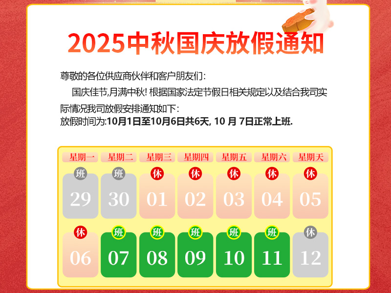 尊敬的各位供應(yīng)商伙伴和客戶朋友們:國慶佳節(jié),月滿中秋!國慶家園月圓人團園,國慶中秋雙節(jié)共歡騰!在此預(yù)祝大家度過一個輕松、愉快的假期.根據(jù)國家法定節(jié)假日相關(guān)規(guī)定,再結(jié)合我司實際情況,現(xiàn)將2025年國慶中秋節(jié)放假安排通知如下:放假時間定為10月1日至10月6日(星期三至星期一),共計6天.2025年 10月 7日(星期二)正式上班,假日期間如有業(yè)務(wù)需求可電話咨詢業(yè)務(wù),感謝大家的理解與配合!秋高氣爽迎中